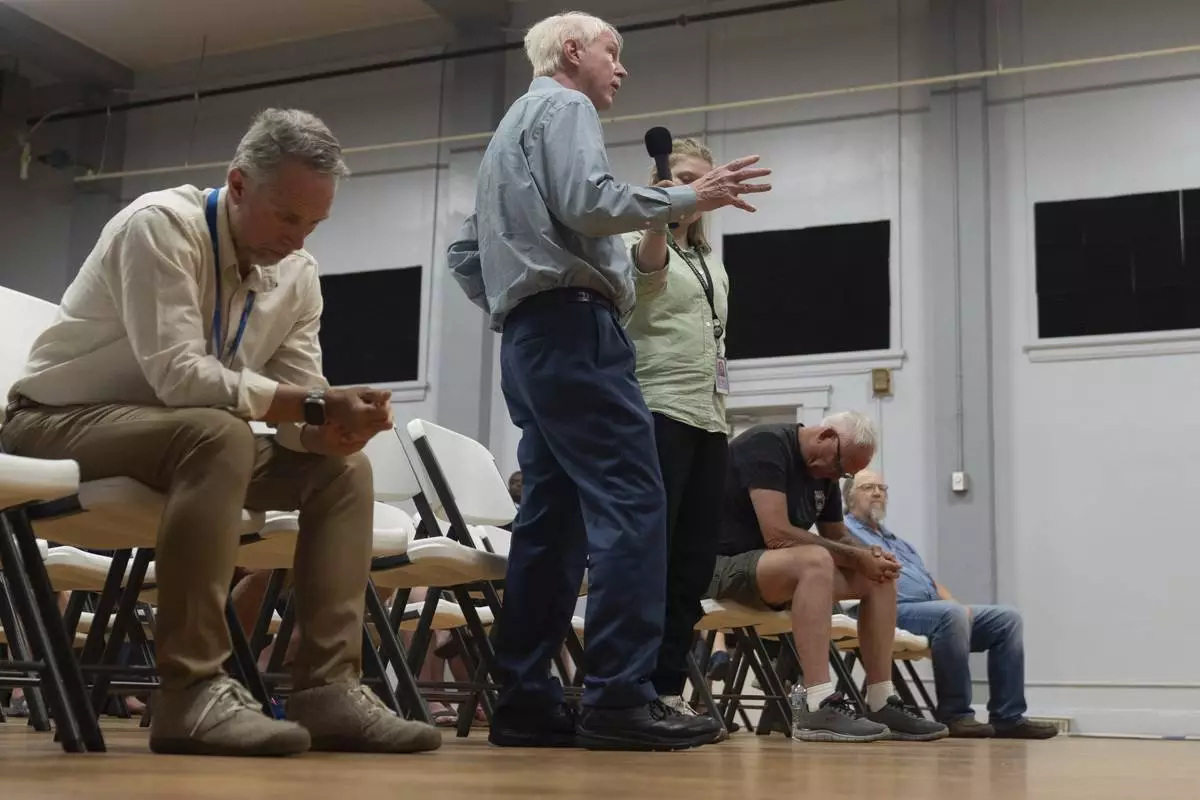 People ask questions as Sen. Ron Wyden, D-Ore., holds a town hall meeting Friday, July 25, 2025, in Wasco, Ore. (AP Photo/Jenny Kane)