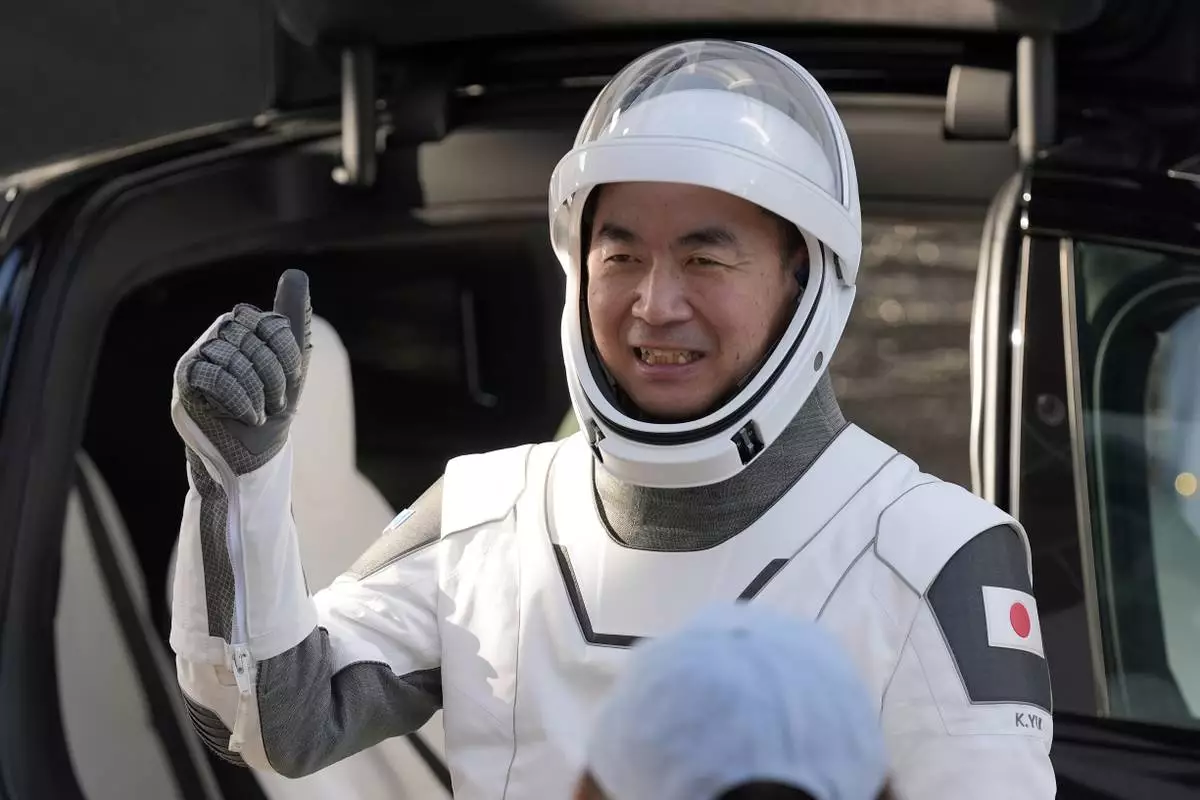 Astronaut Kimiya Yui, of Japan gestures as he leaves the Operations and Checkout Building for a trip the Kennedy Space Center's Launch Pad 39-A and a planned liftoff on a SpaceX Falcon 9 rocket Friday, Aug. 1, 2025, in Cape Canaveral , Fla. (AP Photo/John Raoux)