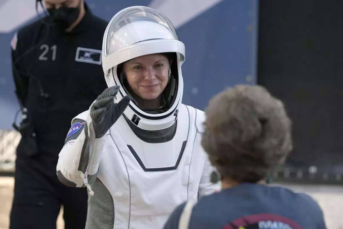 Astronaut Zena Cardman waves as she leaves the Operations and Checkout Building for a trip the Kennedy Space Center's Launch Pad 39-A and a planned liftoff on a SpaceX Falcon 9 rocket Friday, Aug. 1, 2025, in Cape Canaveral , Fla. (AP Photo/John Raoux)