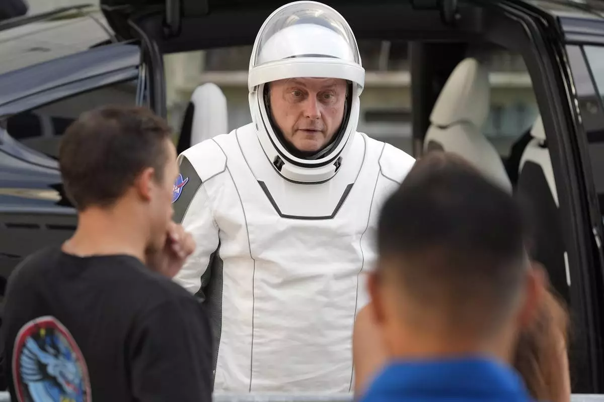Astronaut Mike Fincke speaks to friends as he leaves the Operations and Checkout Building for a trip the Kennedy Space Center's Launch Pad 39-A and a planned liftoff on a SpaceX Falcon 9 rocket Friday, Aug. 1, 2025, in Cape Canaveral , Fla. (AP Photo/John Raoux)