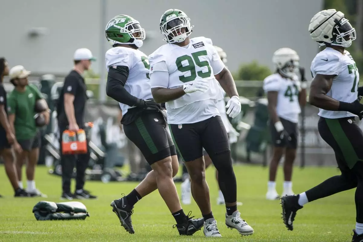 New York Jets defensive tackle Quinnen Williams (95) runs drills during practice at the team's NFL football training camp, Saturday, July 26, 2025, in Florham Park, N.J. (AP Photo/Angelina Katsanis)