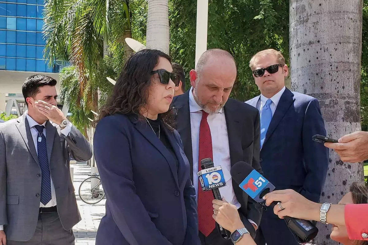 Neima Benavides, whose sister died in a Florida crash involving Tesla’s Autopilot driver assist technology, speaks to reporters outside the federal courthouse in Miami, Friday, Aug. 1, 2025. (AP Photo/David Fischer)