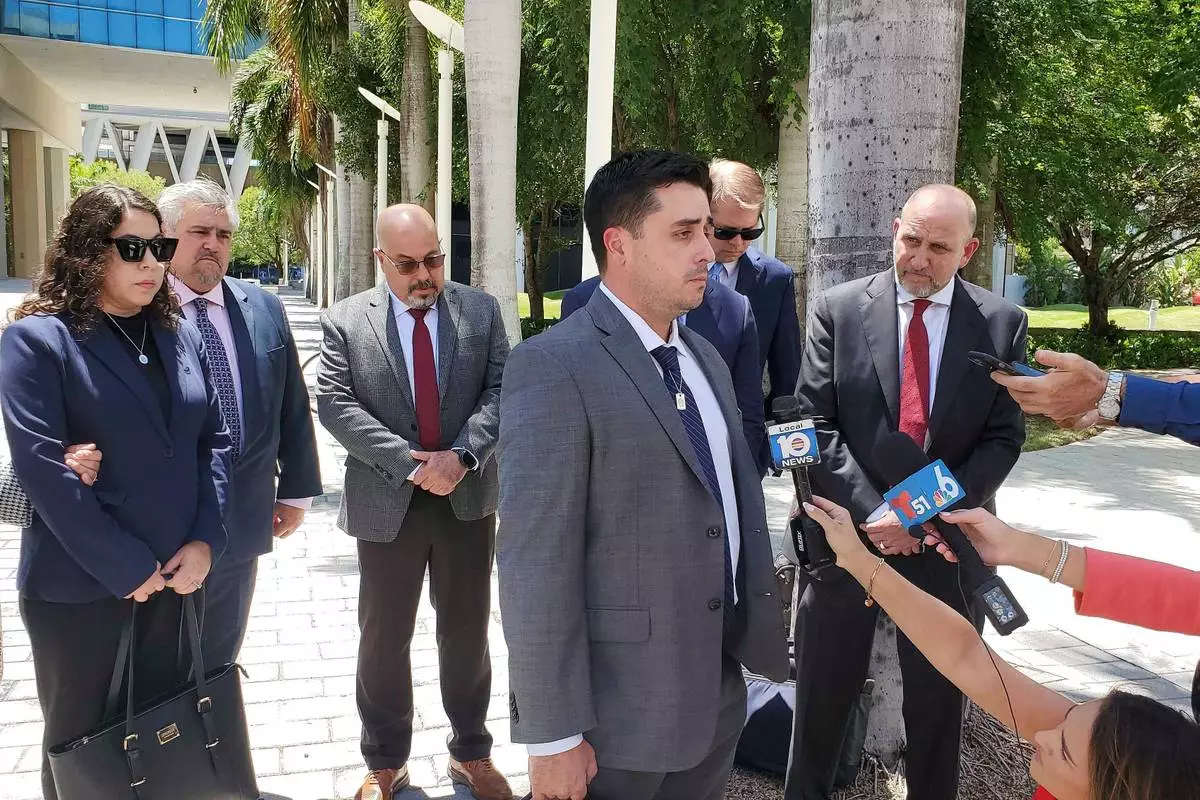 Dillon Angulo, who was seriously injured in a Florida crash involving Tesla’s Autopilot driver assist technology, speaks to reporters outside the federal courthouse in Miami, Friday, Aug. 1, 2025. (AP Photo/David Fischer)