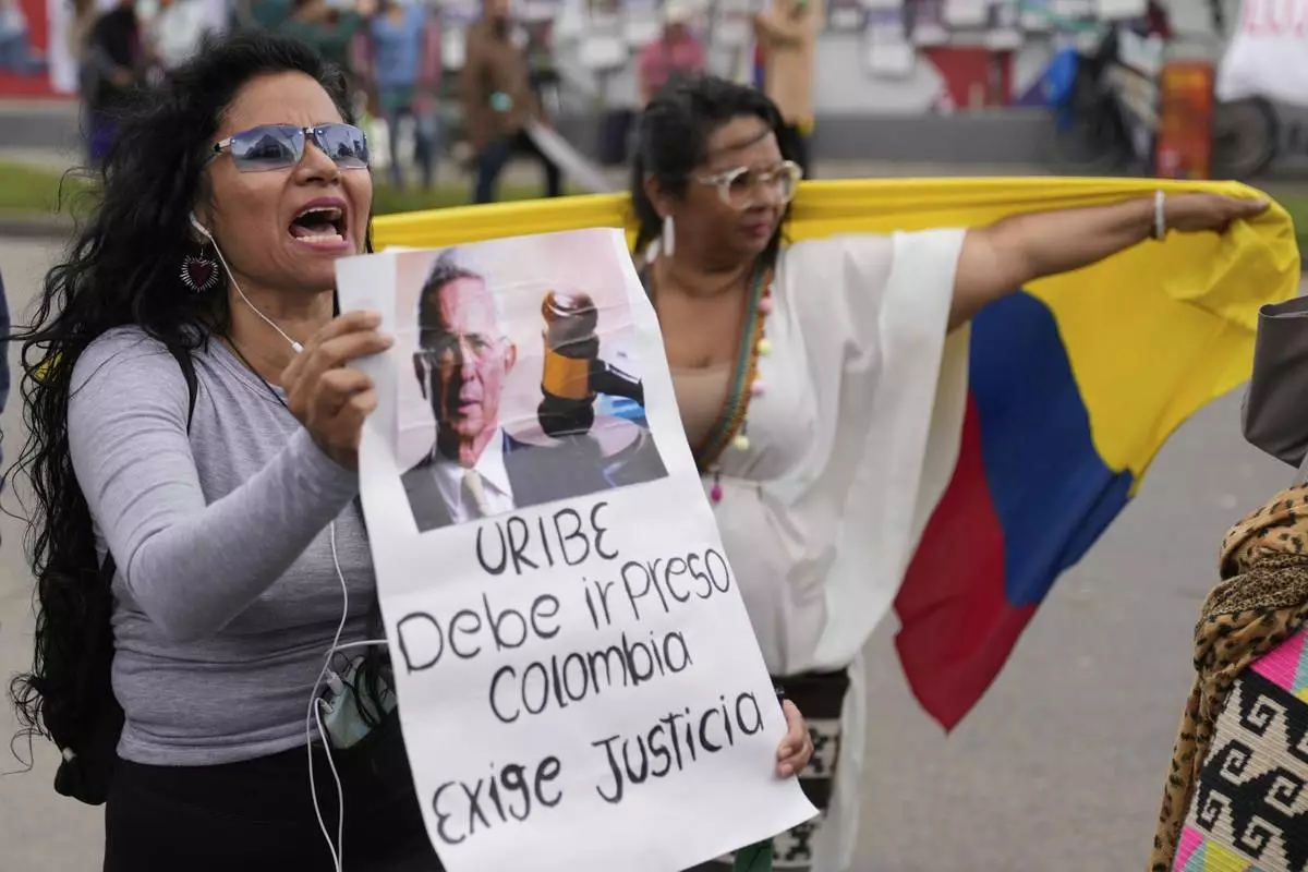 Opponents of former President Alvaro Uribe gather outside the court on the day he was sentenced to 12 years under house arrest for witness tampering and bribery in Bogota, Colombia, Friday, Aug. 1, 2025. (AP Photo/Fernando Vergara)