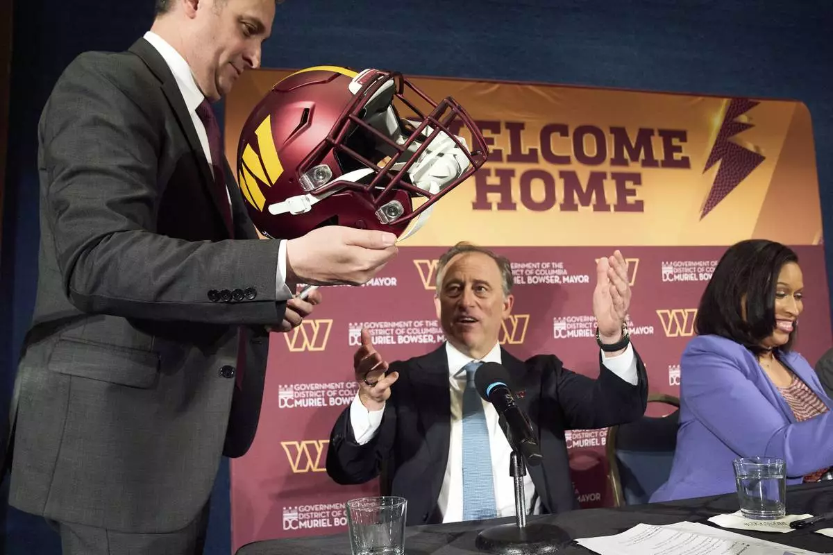 FILE - Washington Commanders controlling owner Josh Harris, center, is passed a helmet to sign next to District of Columbia Mayor Muriel Bowser, right, after announcing a new home for the NFL football team on the site of the old RFK Stadium, Monday, April 28, 2025, at the National Press Club in Washington. (AP Photo/Jacquelyn Martin, File)