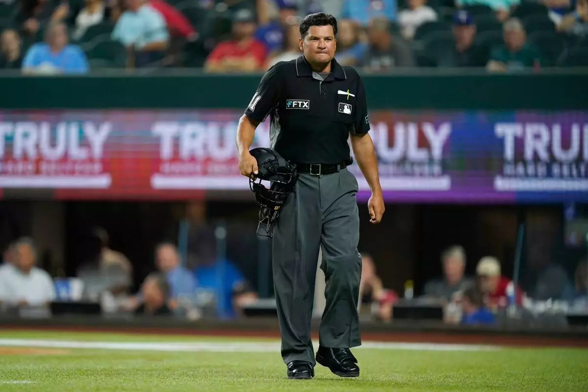 FILE - Umpire Charlie Ramos walks to the Philadelphia Phillies dugout during a baseball game against the Texas Rangers, Wednesday, June 22, 2022, in Arlington, Texas. (AP Photo/Tony Gutierrez, File)