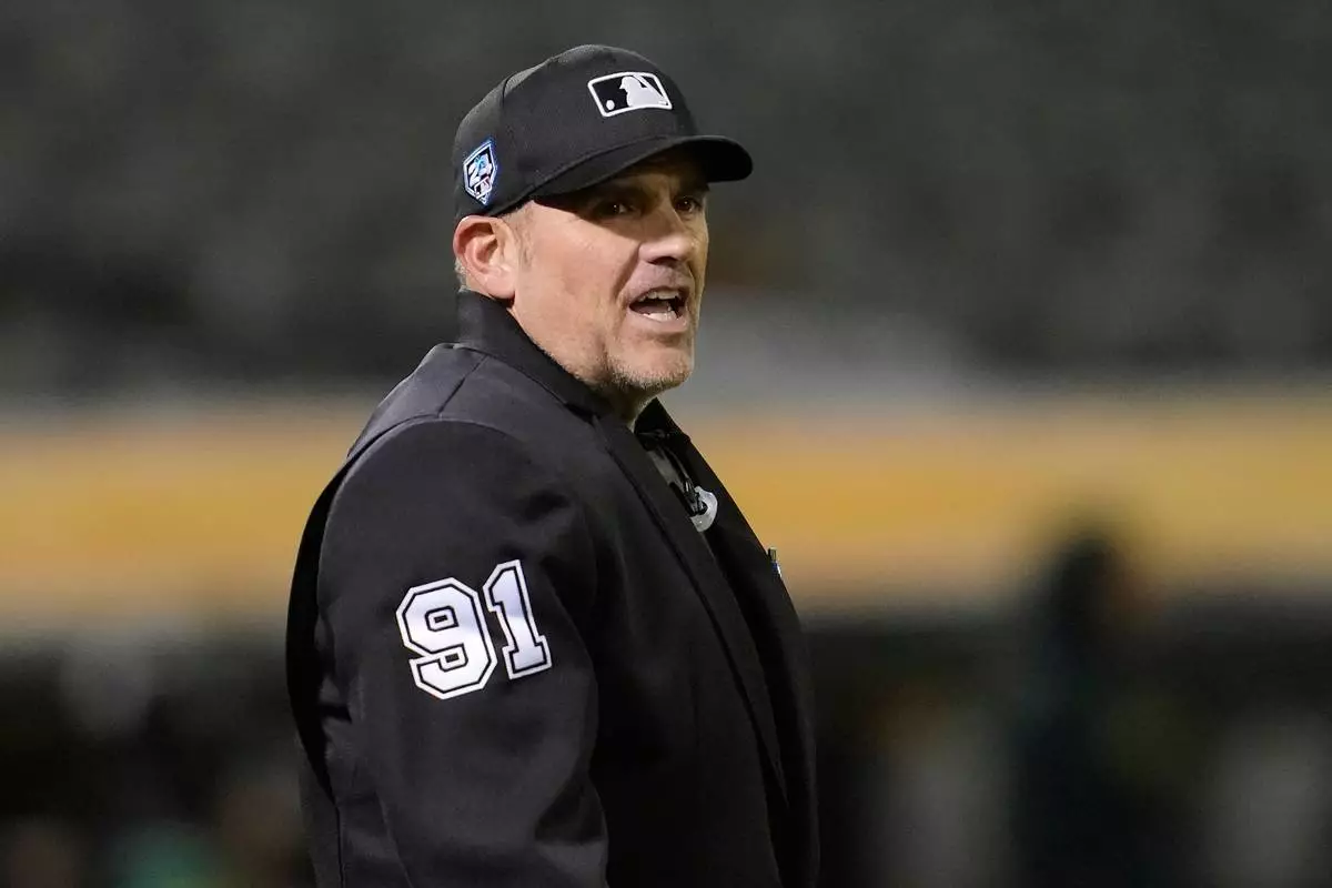 FILE - Umpire Brian Knight works during a spring training baseball game between the Oakland Athletics and the San Francisco Giants in Oakland, Calif., Monday, March 25, 2024. (AP Photo/Jeff Chiu, File)