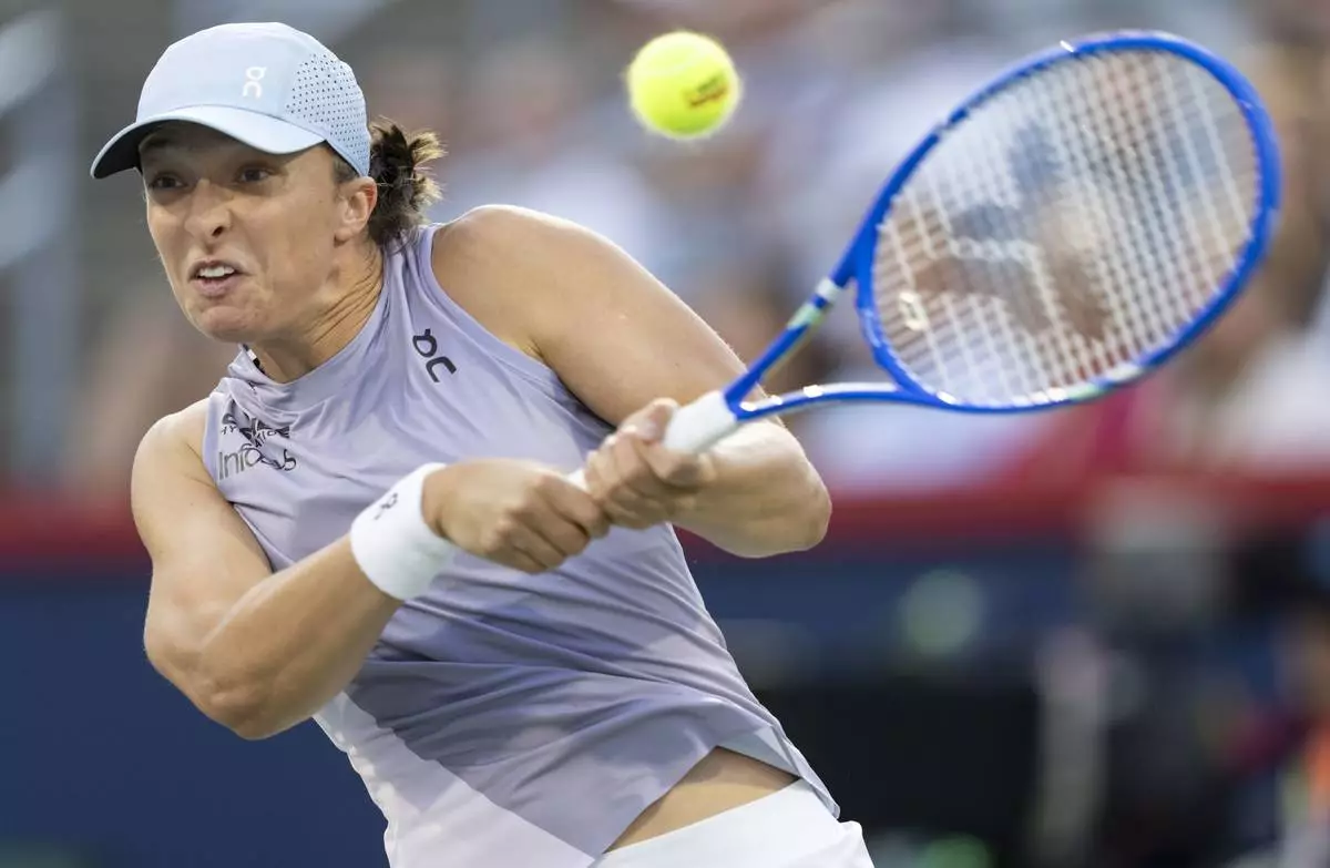 Iga Swiatek, of Poland, hits a return to Eva Lys, of Germany, during third-round match action at the National Bank Open women's tennis tournament in Montreal, Friday, Aug. 1, 2025. (Christinne Muschi/The Canadian Press via AP)