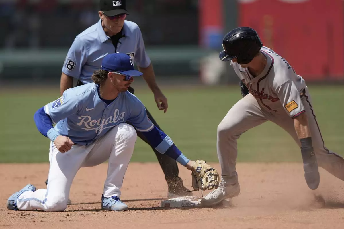 Atlanta Braves' Luke Williams, right, beats the tag by Kansas City Royals shortstop Bobby Witt Jr. to steal second during the eighth inning of a baseball game Wednesday, July 30, 2025, in Kansas City, Mo. (AP Photo/Charlie Riedel)