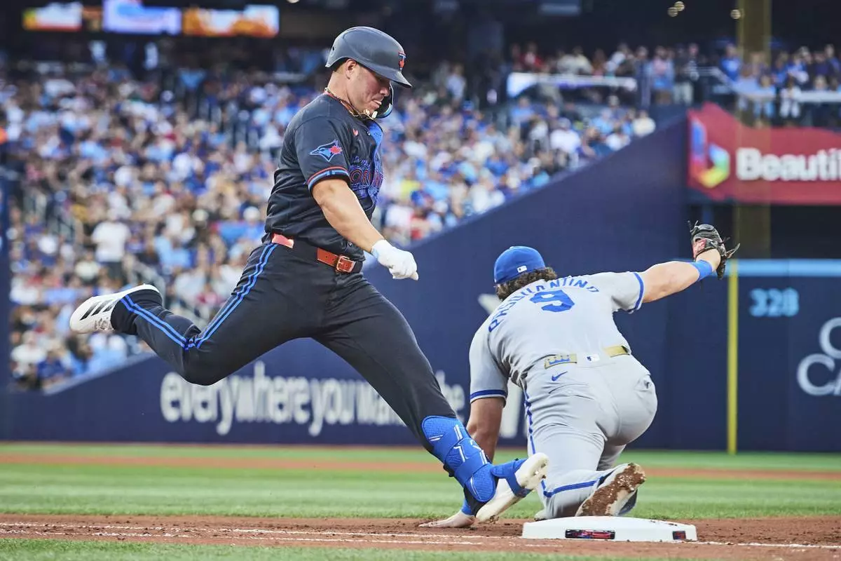 Toronto Blue Jays' Daulton Varsho, left, is out as Kansas City Royals first baseman Vinnie Pasquantino (9) makes a catch during fourth-inning baseball game action in Toronto, Friday, Aug. 1, 2025. (Sammy Kogan/The Canadian Press via AP)