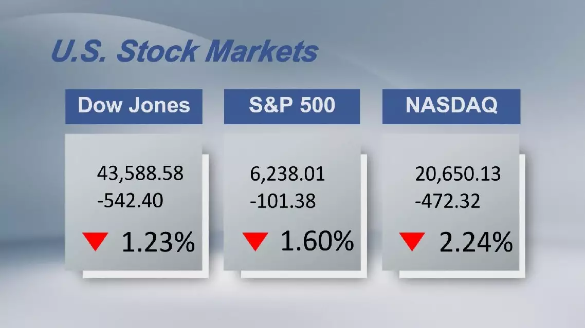 The Dow Jones Industrial Average dropped 542.4 points, or 1.23 percent, to 43,588.58. The Standard and Poor's 500 declined 1.6 percent to 6,238.01, and the Nasdaq Composite slid 2.24 percent to 20,650.13.