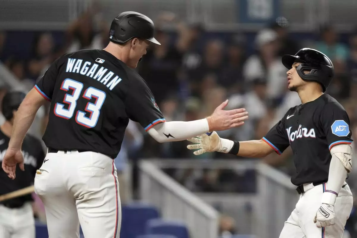 Miami Marlins' Javier Sanoja, right, celebrates after hitting a two-run homer that also brought home Eric Wagaman, in the fifth inning of a baseball game against the New York Yankees, Friday, Aug. 1, 2025, in Miami. (AP Photo/Rebecca Blackwell)
