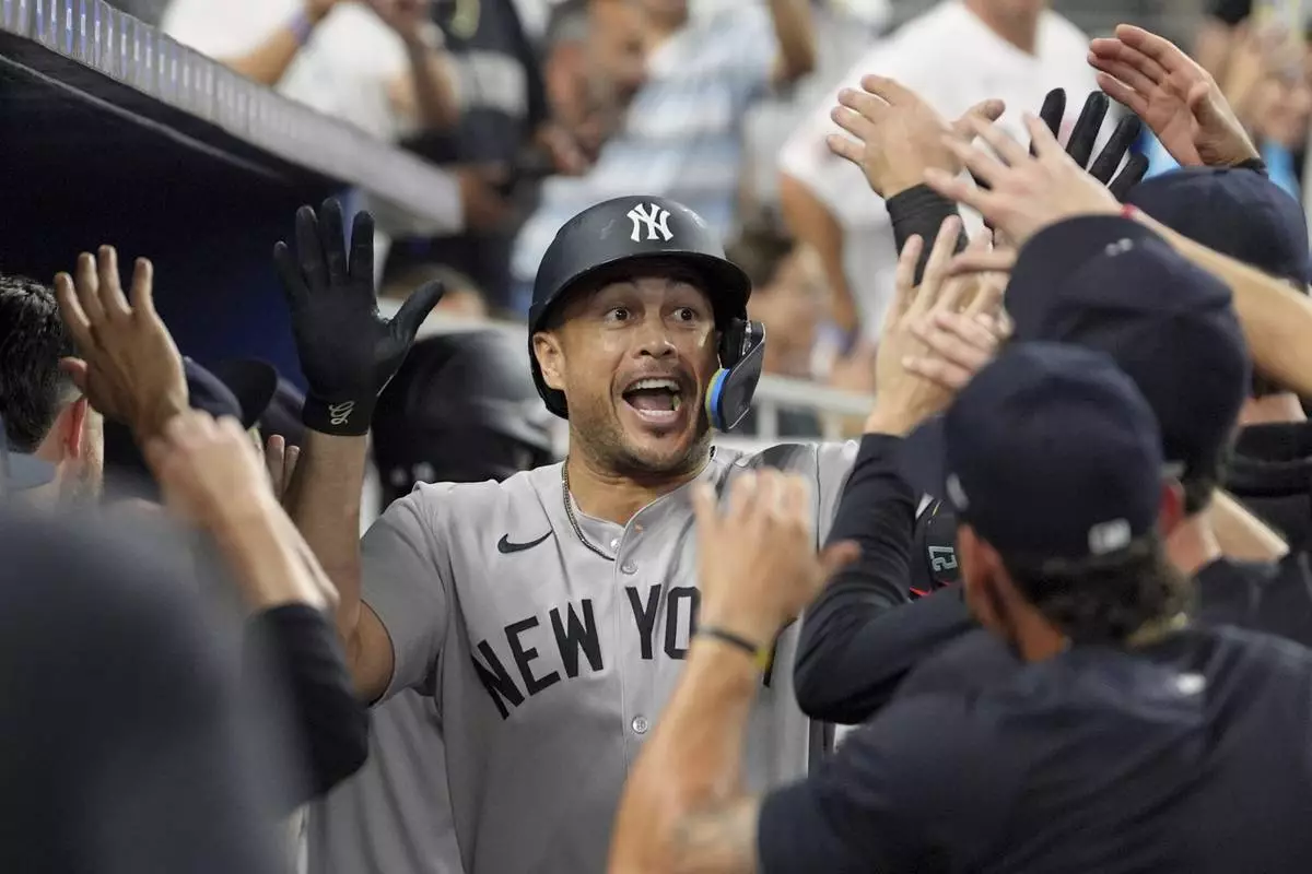 New York Yankees designated hitter Giancarlo Stanton (27) celebrates with teammates after hitting a three-run homer in the fourth inning of a baseball game against the Miami Marlins, Friday, Aug. 1, 2025, in Miami. (AP Photo/Rebecca Blackwell)