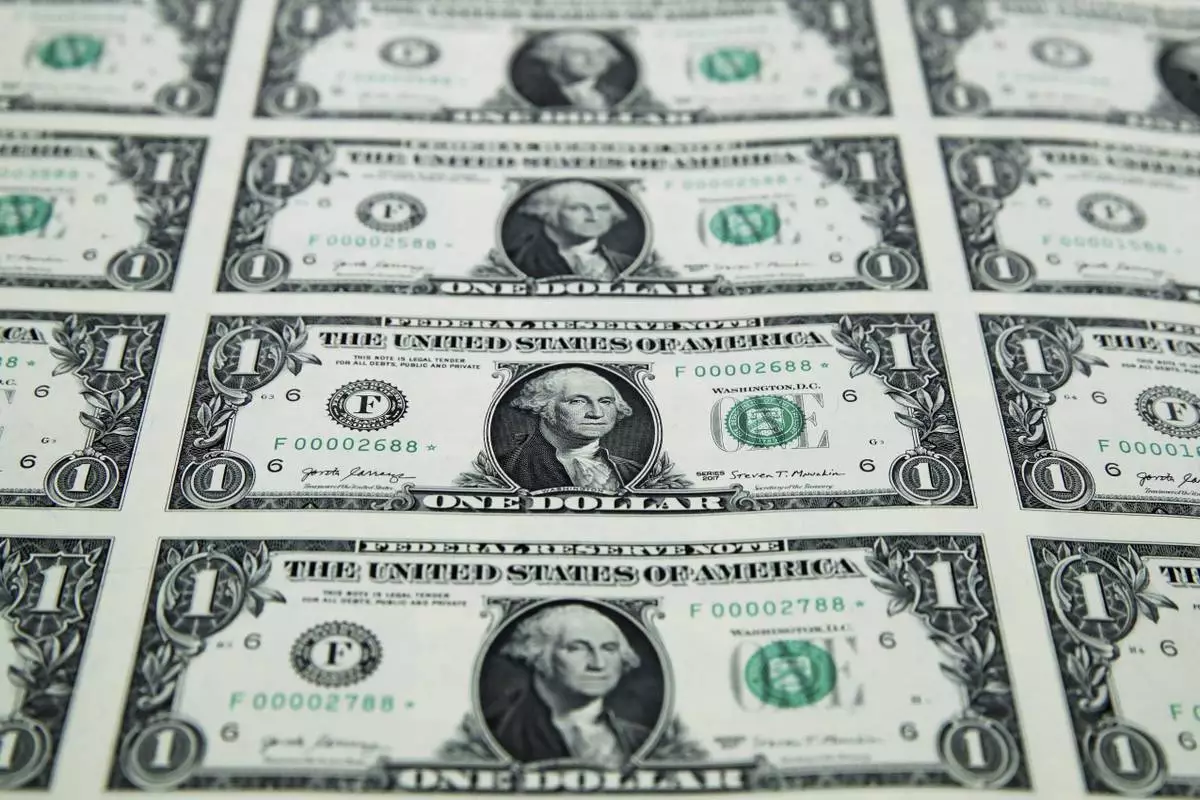 FILE - A sheet of new $1 bills is seen, Nov. 15, 2017, at the Bureau of Engraving and Printing in Washington. (AP Photo/Jacquelyn Martin, File)