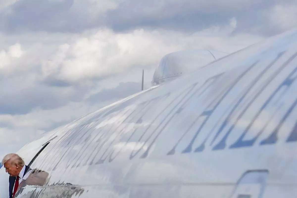 President Donald Trump disembarks Air Force One at Lehigh Valley International Airport, Friday, Aug. 1, 2025, in Allentown, Pa. (AP Photo/Julia Demaree Nikhinson)