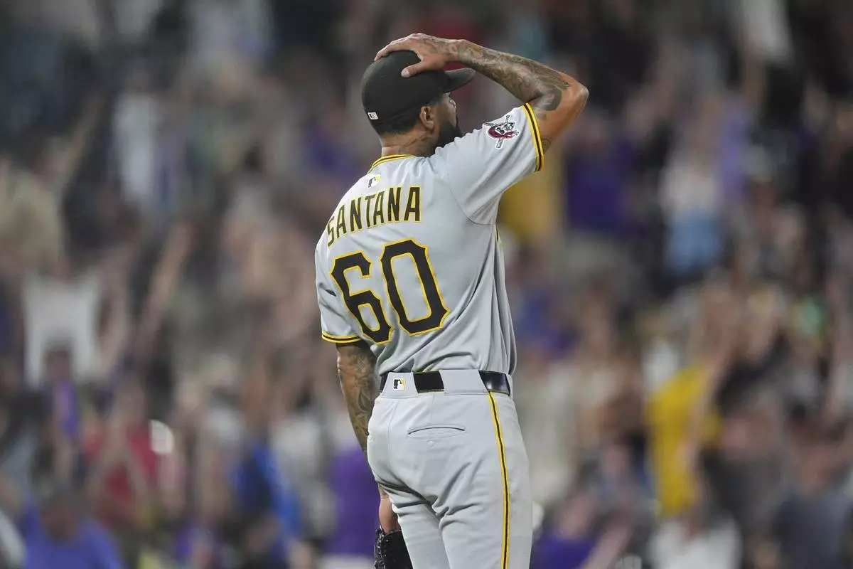 Pittsburgh Pirates relief pitcher Dennis Santana reacts after giving up a two-run, walkoff home run to Colorado Rockies' Brenton Doyle in the ninth inning of a baseball game Friday, Aug. 1, 2025, in Denver. (AP Photo/David Zalubowski)