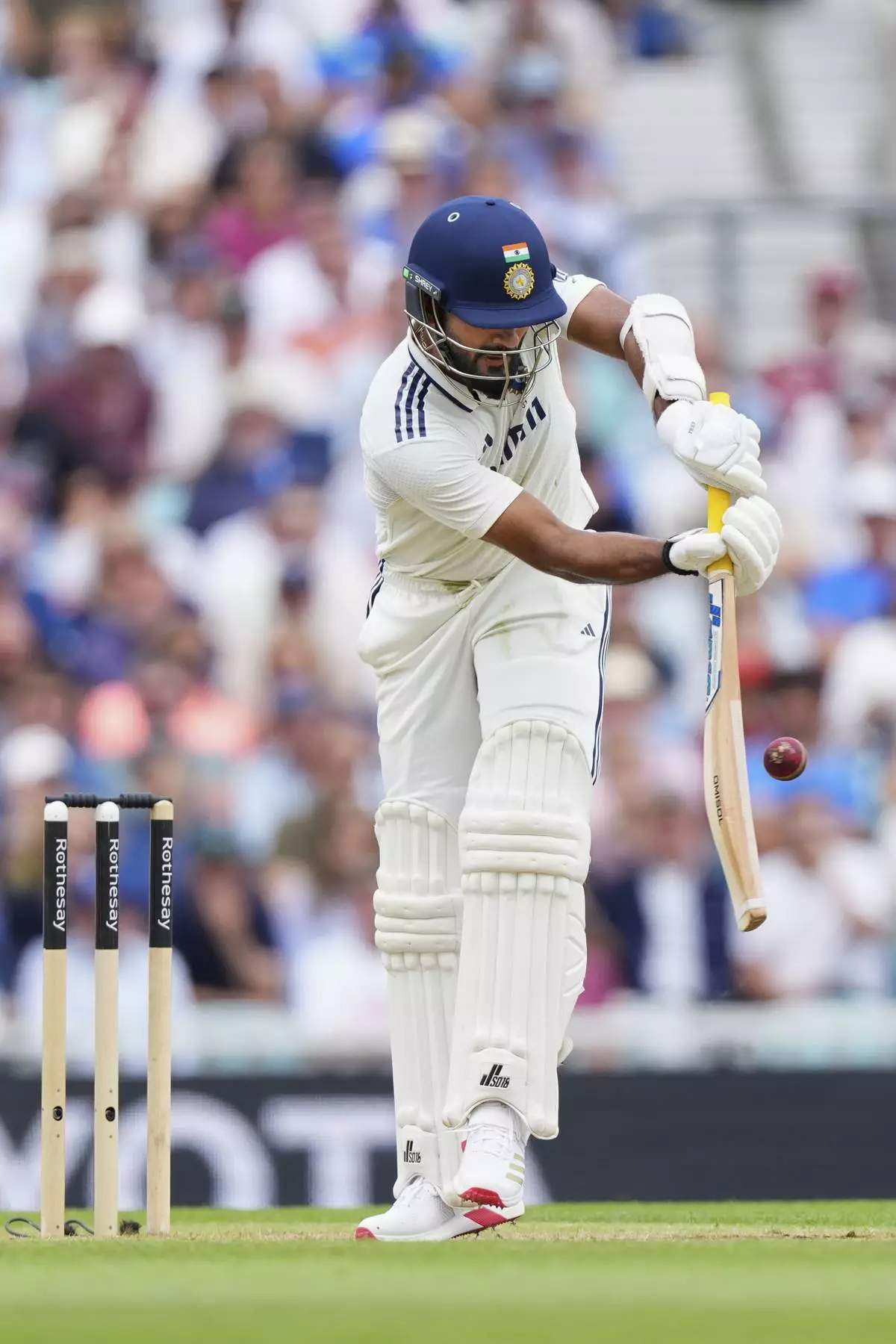India's Akash Deep plays a shot during the third day of the fifth cricket test match between England and India at The Kia Oval in London, Saturday, Aug. 2, 2025. (AP Photo/Kirsty Wigglesworth)