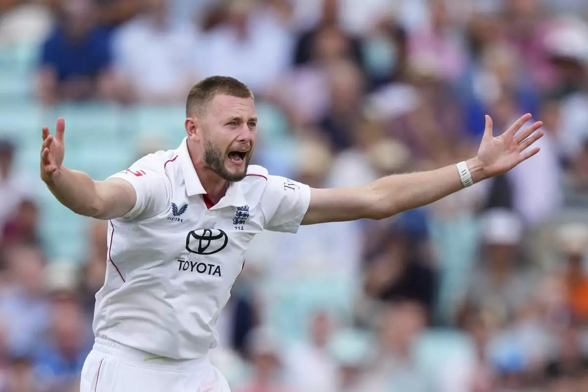 England's Gus Atkinson celebrates the dismissal of India's captain Shubman Gill during the third day of the fifth cricket test match between England and India at The Kia Oval in London, Saturday, Aug. 2, 2025. (AP Photo/Kirsty Wigglesworth)