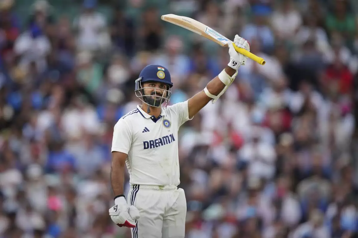 India's Akash Deep celebrates after scoring fifty runs during the third day of the fifth cricket test match between England and India at The Kia Oval in London, Saturday, Aug. 2, 2025. (AP Photo/Kirsty Wigglesworth)