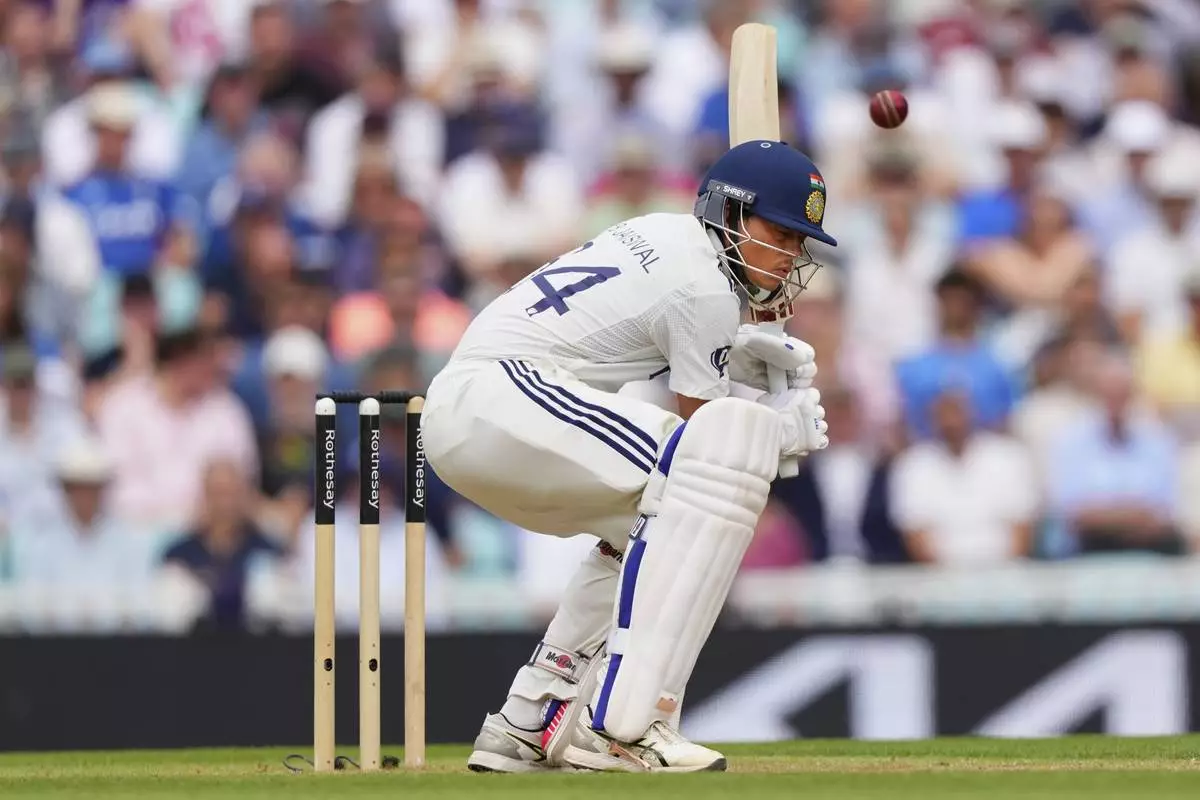 India's Yashasvi Jaiswal plays a shot during the third day of the fifth cricket test match between England and India at The Kia Oval in London, Saturday, Aug. 2, 2025. (AP Photo/Kirsty Wigglesworth)