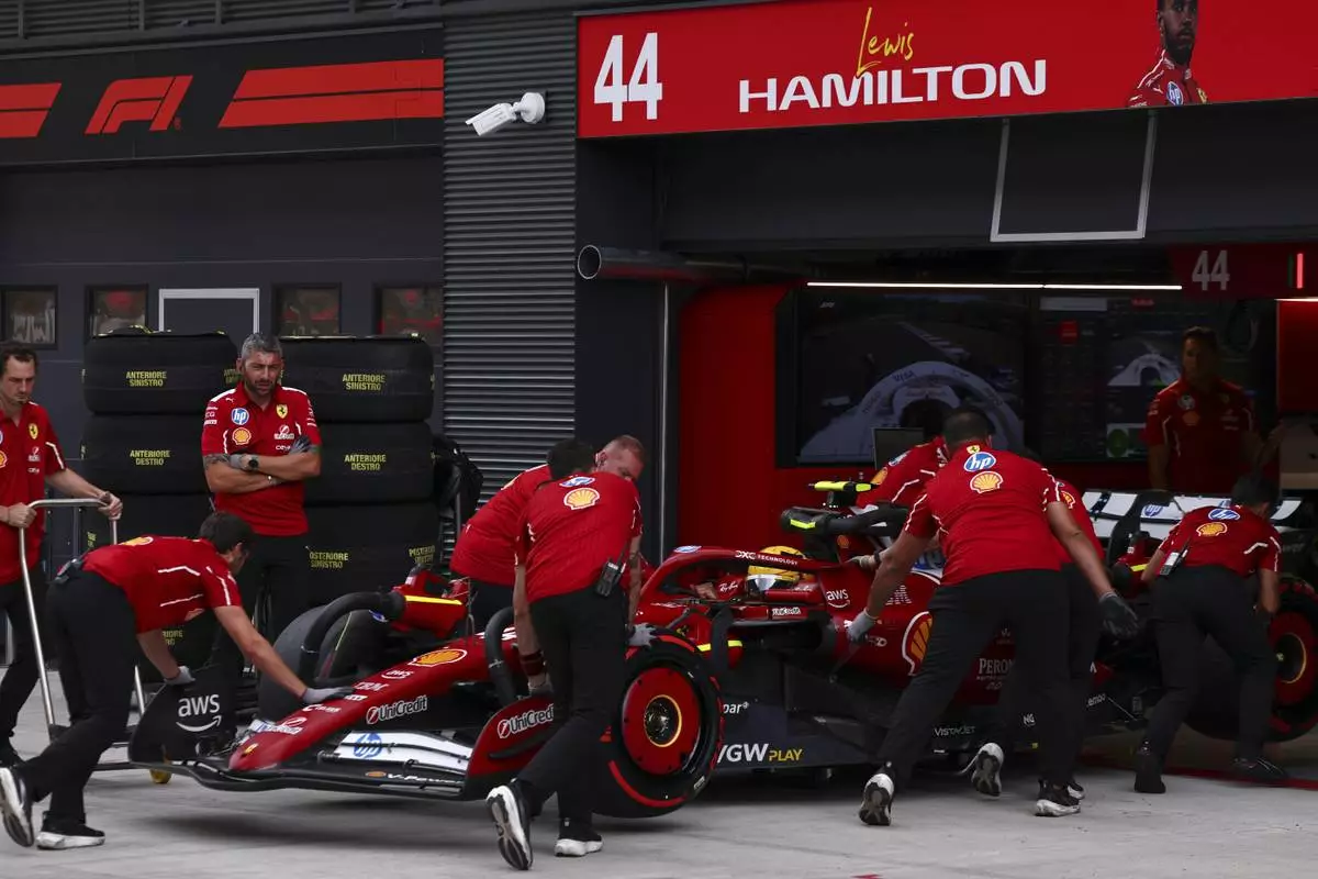 Ferrari driver Lewis Hamilton of Britain gets pushed back into his garage during the qualifying session for the Hungarian Formula One Grand Prix at the Hungaroring racetrack in Mogyorod, Hungary, Saturday, Aug. 2, 2025. (Anna Szilagyi/Pool Photo via AP)