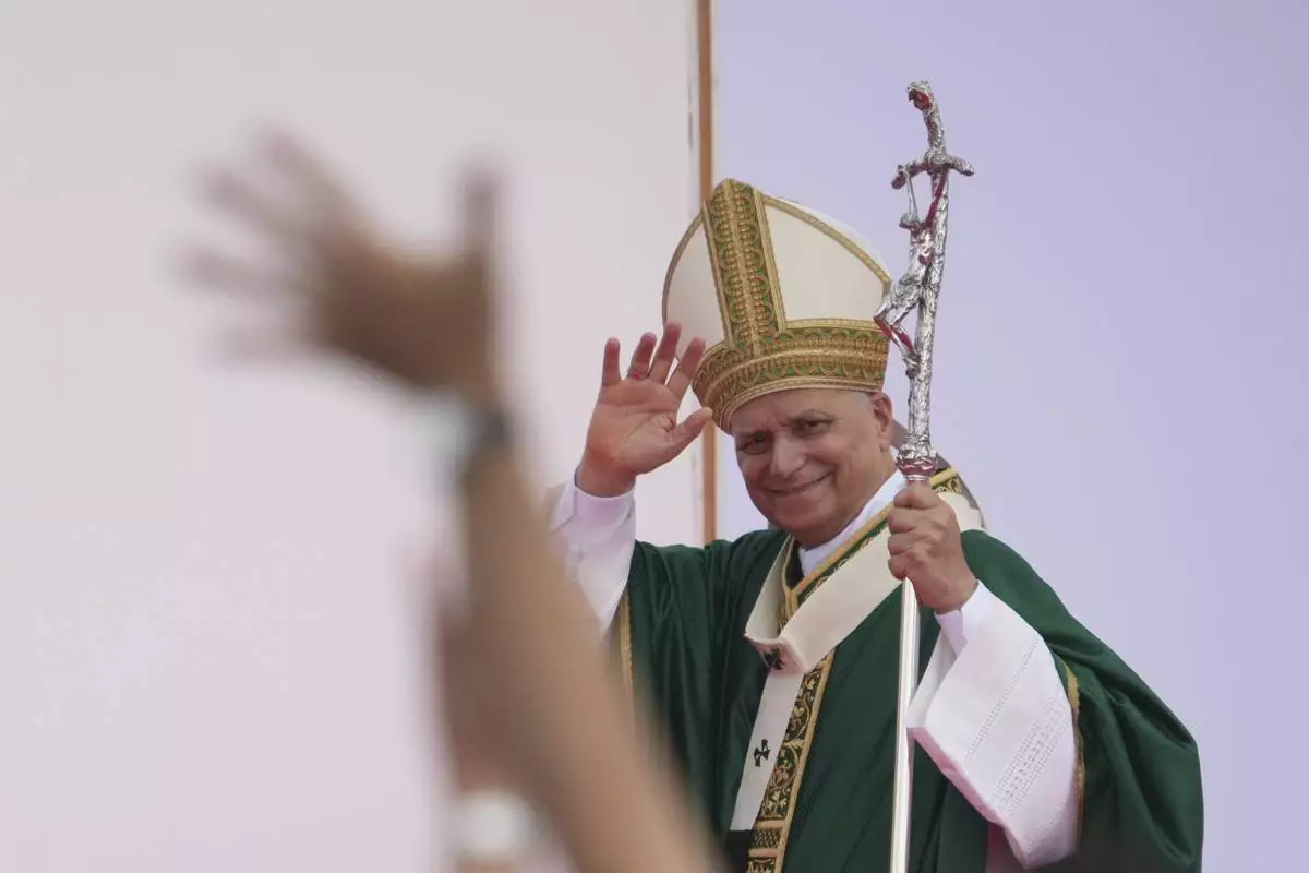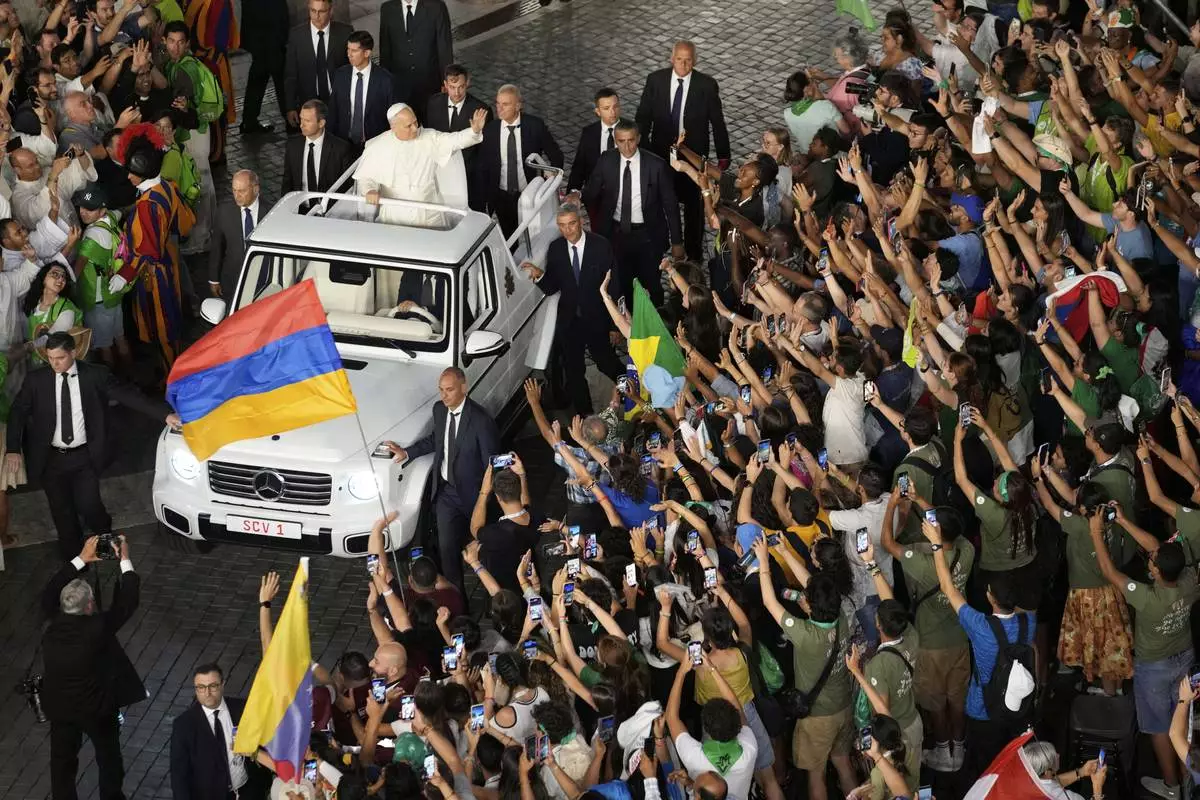 Pope Leo XIV leaves at the end of a Mass with young people participating in the Youths Jubilee at the Tor Vergata field in Rome, Sunday, Aug. 3, 2025. (AP Photo/Gregorio Borgia)