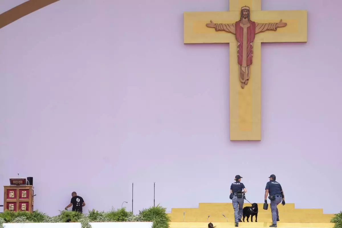 Italian Police officers patrol in the Youths Jubilee at the Tor Vergata field in Rome, Saturday, Aug. 2, 2025. (AP Photo/Gregorio Borgia)