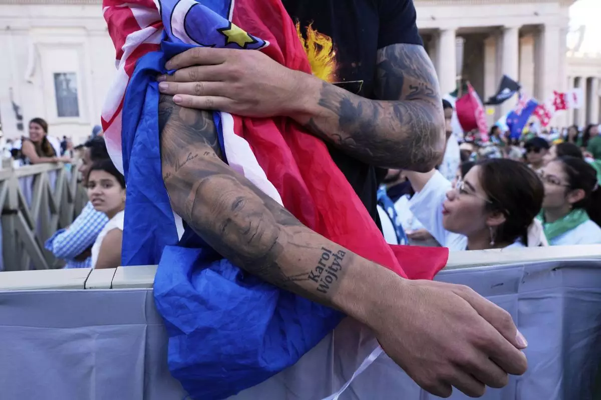 Martin Kresic, of Croatia, shows his tattoo of late Pope John Paul II as he waits for the start of a welcome mass for the Youth Jubilee in St. Peter's Square at the Vatican, Tuesday, July 29, 2025. (AP Photo/Gregorio Borgia)