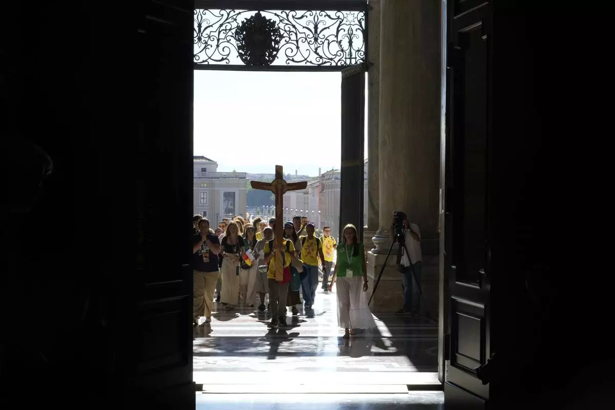 Faithful walk through the St. Peter's Basilica holy door on the occasion of the Youth Jubilee at the Vatican, Tuesday, July 29, 2025. (AP Photo/Gregorio Borgia)