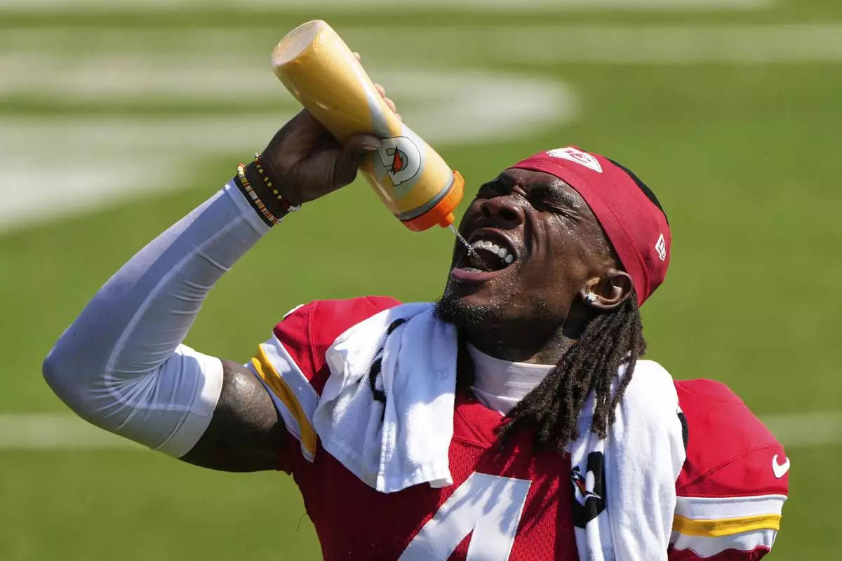 Kansas City Chiefs wide receiver Rashee Rice takes a drink during Back Together Weekend at the team's NFL football training camp, Sunday, July 27, 2025, in St. Joseph, Mo. (AP Photo/Charlie Riedel)