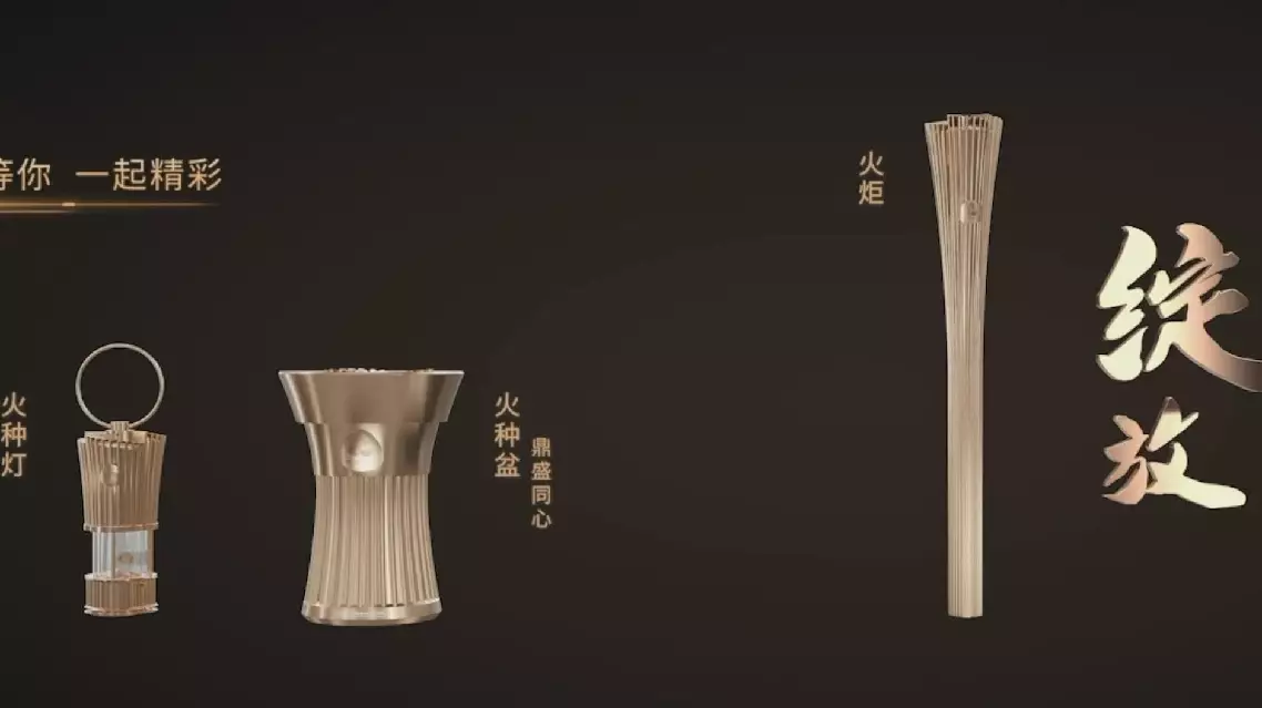 The torch's body features a streamlined metal frame and a peony pattern at its base, symbolizing the three regions' unity and prosperity. The gold-colored torch stands 760 millimeters tall, weighs 1.6 kilograms, and has a maximum diameter of 125 millimeters at the flame port.