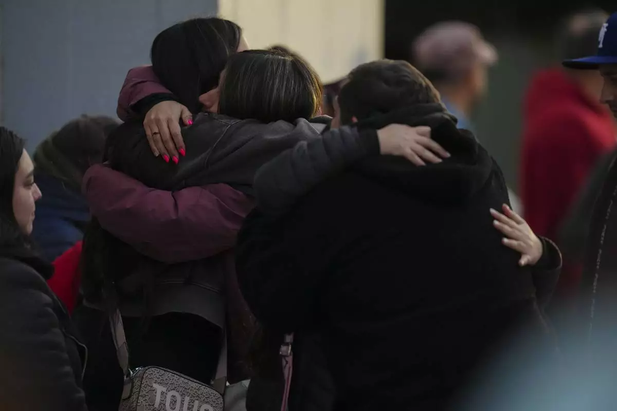 Relatives of a missing miner embrace in front of the offices of Codelco, operators of El Teniente copper mine where a cave-in killed one worker and trapped five others underground, halting operations in Rancagua, Chile, Saturday, Aug. 2, 2025. (AP Photo/Esteban Felix)
