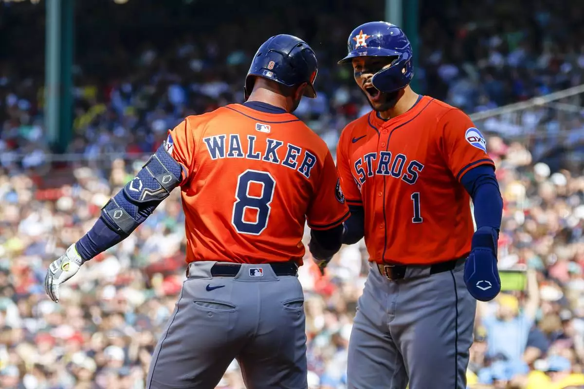 Houston Astros' Christian Walker (8) celebrates with Carlos Correa (1) after hitting a two run homer in the first inning of a baseball game, Saturday, Aug. 2, 2025, in Boston. (AP Photo/Greg M. Cooper)