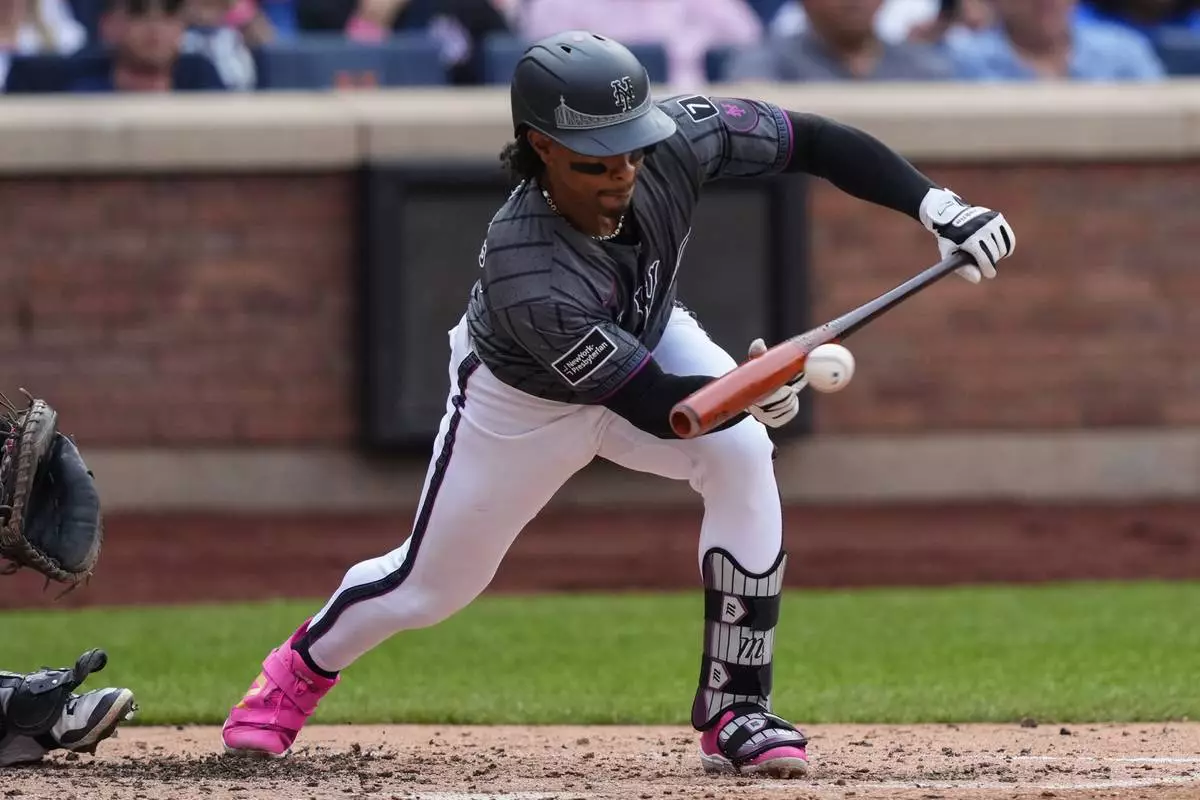 New York Mets' Francisco Lindor hits a bunt single during the fourth inning of a baseball game against the San Francisco Giants, Saturday, Aug. 2, 2025, in New York. (AP Photo/Yuki Iwamura)