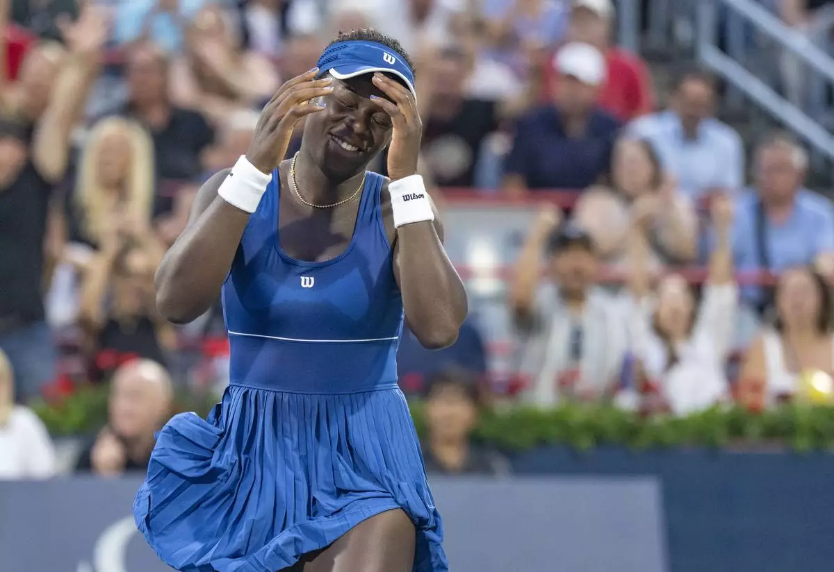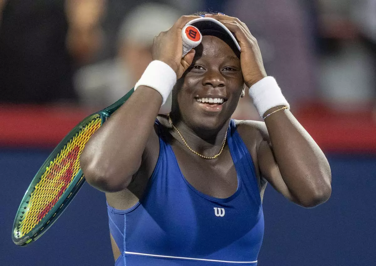 Victoria Mboko, of Canada, reacts after her win over Coco Gauff, of the United States, during round of 16 match action at the National Bank Open women's tennis tournament in Montreal, Saturday, Aug. 2, 2025. (Christinne Muschi/The Canadian Press via AP)