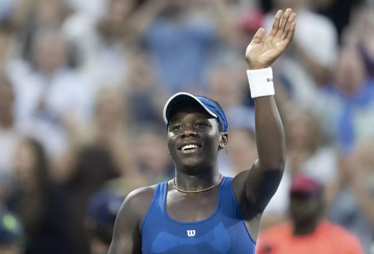 Victoria Mboko, of Canada, waves to the crowd following her win over Coco Gauff, of the United States, during round of 16 match action at the National Bank Open women's tennis tournament in Montreal, Saturday, Aug. 2, 2025. (Christinne Muschi/The Canadian Press via AP)