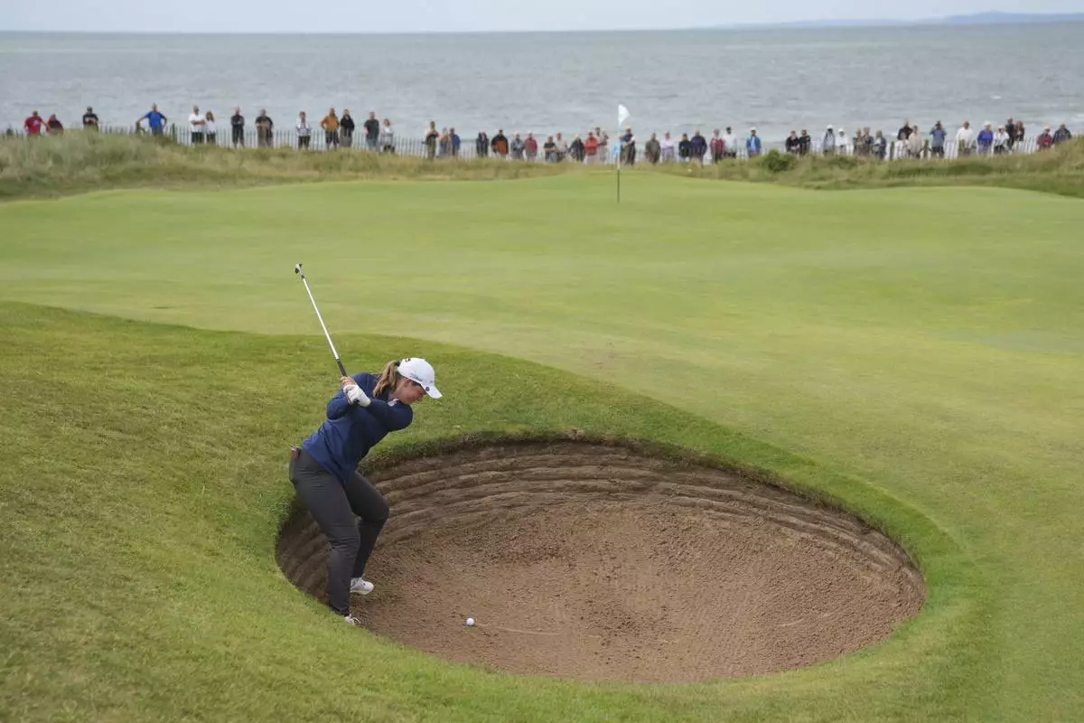 Lottie Woad of England plays out of a bunker on the 1st green during the third round of the Women's British Open golf championship, at Royal Porthcawl Golf Club in Porthcawl, Wales, Saturday, Aug. 2, 2025. (AP Photo/Kin Cheung)