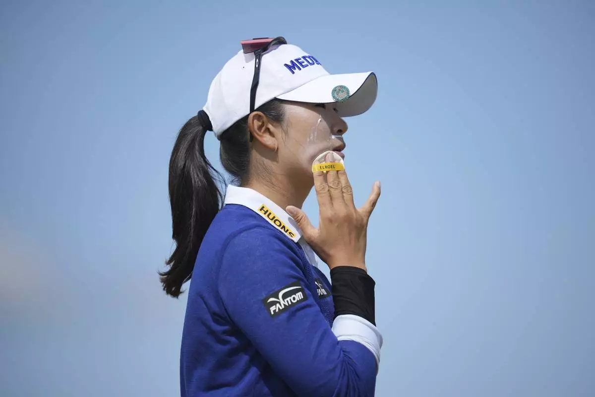 A Lim Kim of South Korea applies cream to her face as she competes during the first round of the Women's British Open golf championship, at Royal Porthcawl Golf Club in Porthcawl, Wales, Thursday, July 31, 2025. (AP Photo/Kin Cheung)
