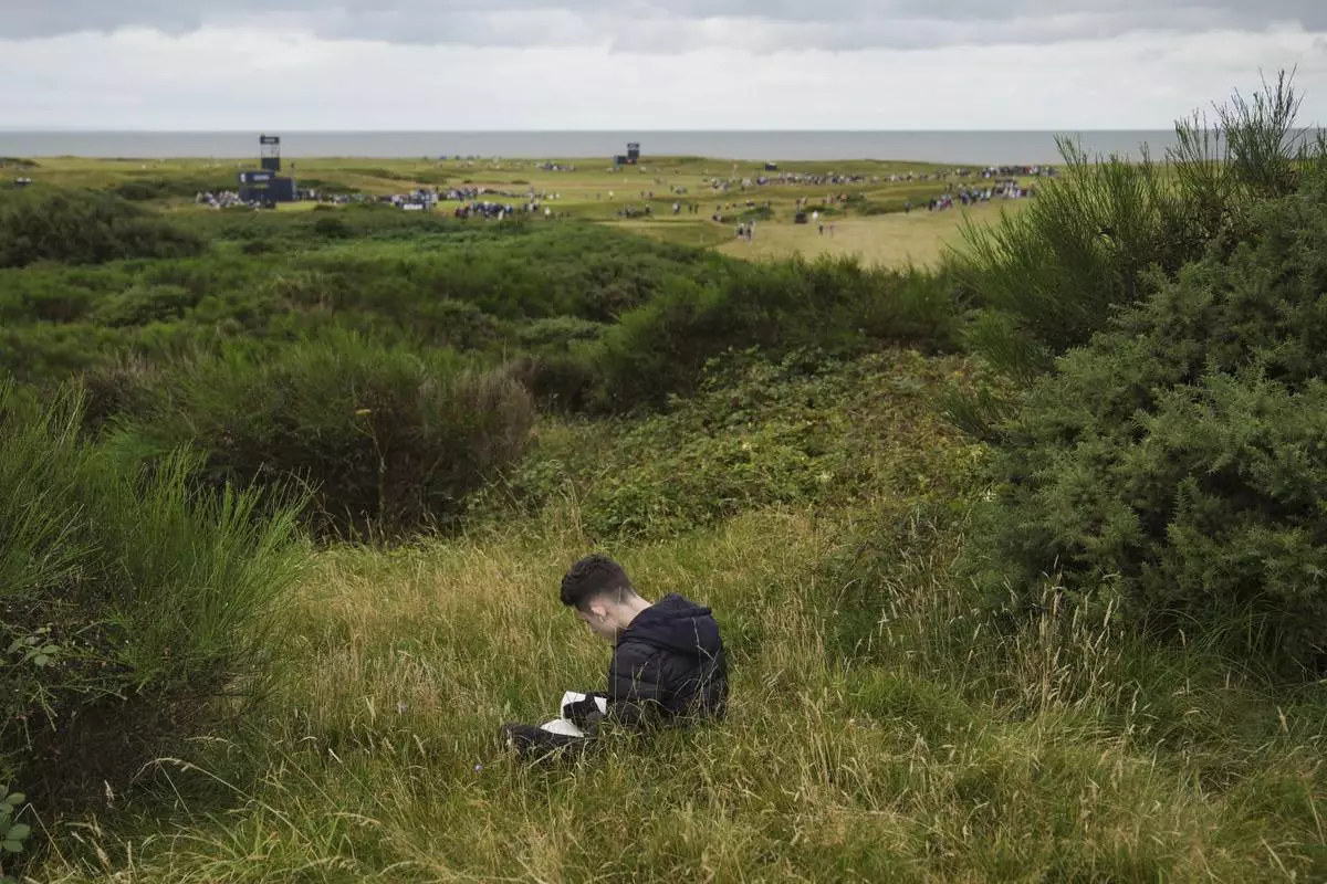A man reads a book during the second round of the Women's British Open golf championship, at Royal Porthcawl Golf Club in Porthcawl, Wales, Friday, Aug. 1, 2025. (AP Photo/Kin Cheung)