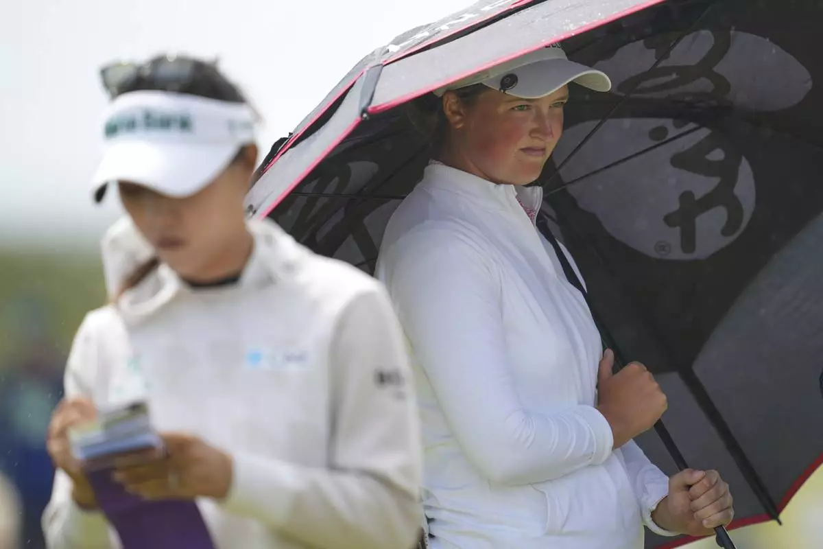 Lydia Ko of New Zealand, left, and Lottie Woad of England wait during the first round of the Women's British Open golf championship, at Royal Porthcawl Golf Club in Porthcawl, Wales, Thursday, July 31, 2025. (AP Photo/Kin Cheung)