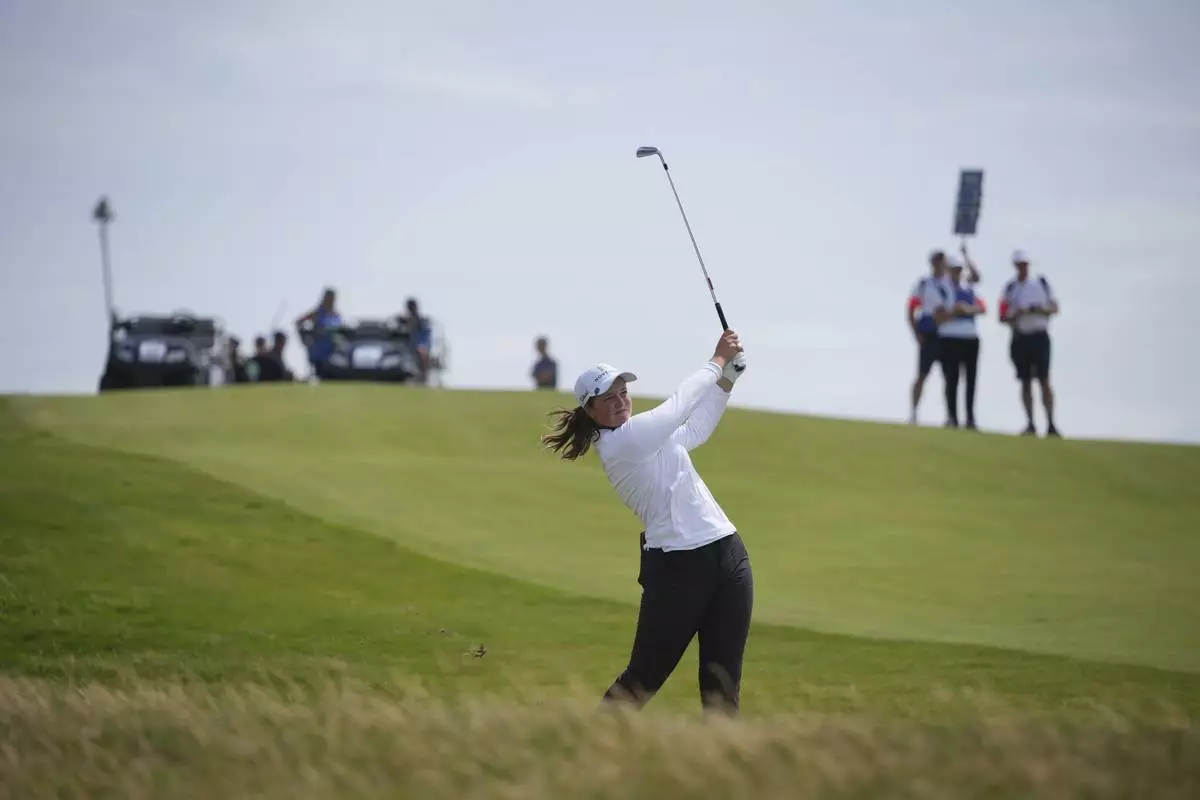 Lottie Woad of England competes during the first round of the Women's British Open golf championship, at Royal Porthcawl Golf Club in Porthcawl, Wales, Thursday, July 31, 2025. (AP Photo/Kin Cheung)