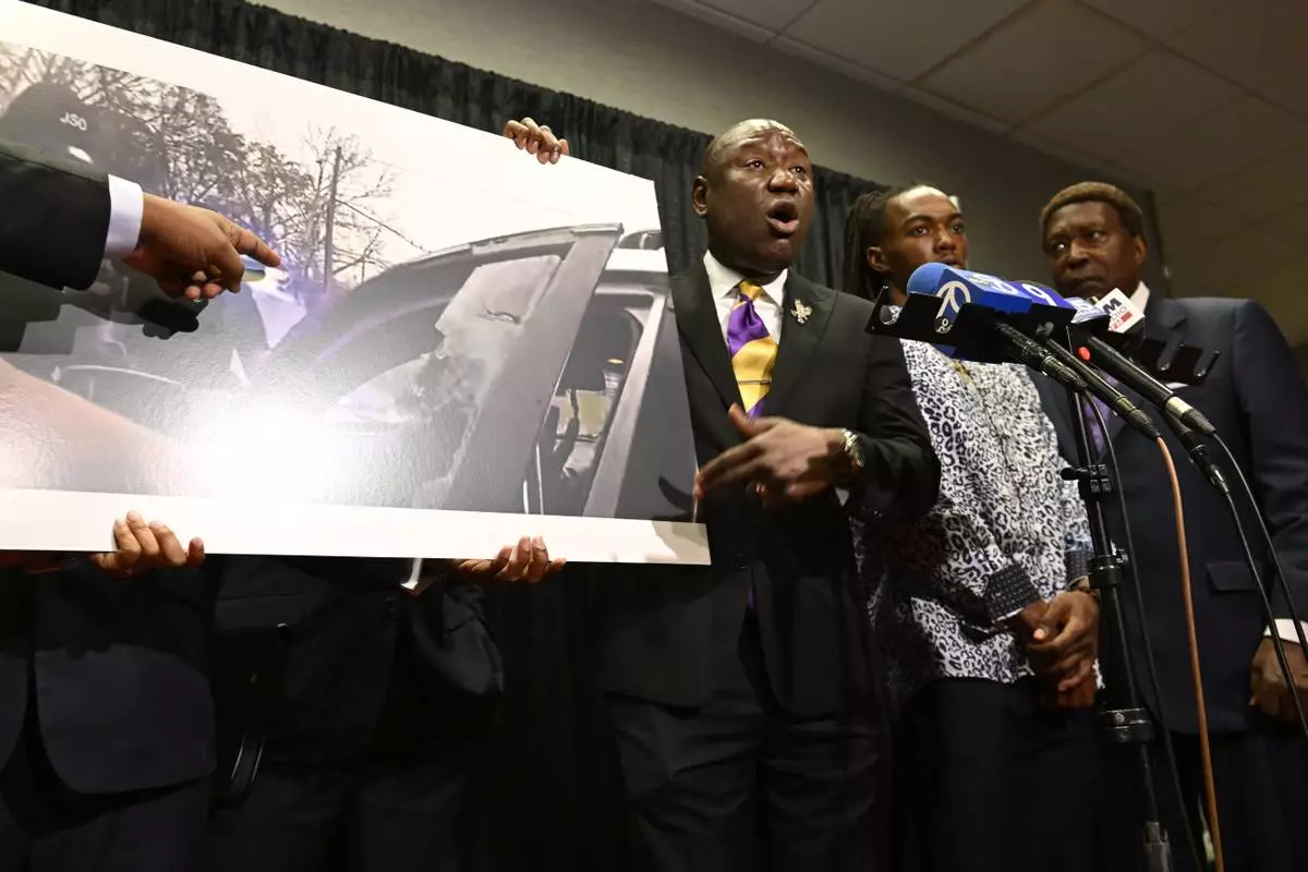 William McNeil Jr.'s attorney Ben Crump, center, speaks while showing a still from a police body cam video during a press conference Tuesday, July 29, 2025, in Chicago. (AP Photo/Paul Beaty)