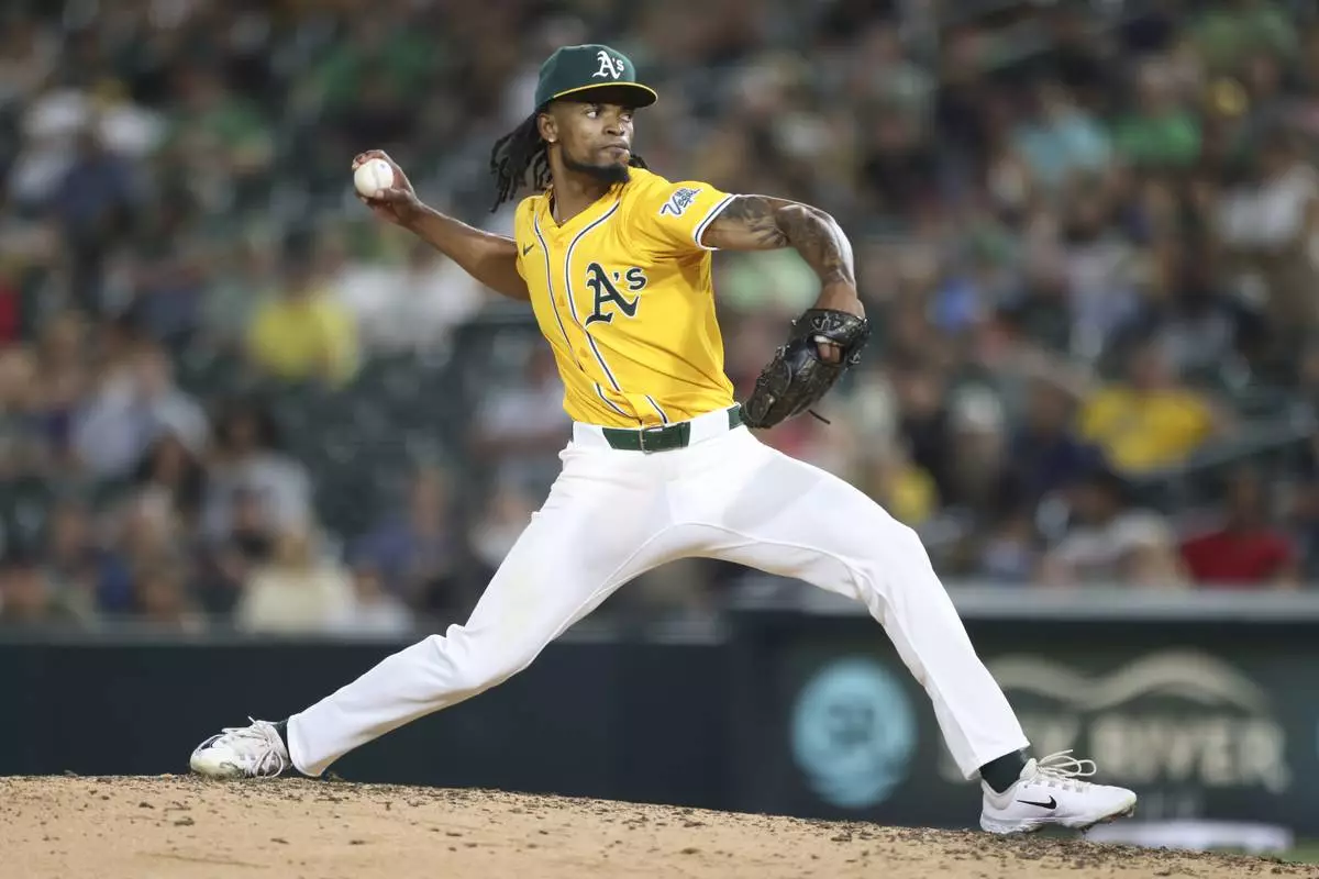 Athletics pitcher Eduarniel Núñez throws to an Arizona Diamondbacks batter during the eighth inning of a baseball game Saturday, Aug. 2, 2025, in West Sacramento, Calif. (AP Photo/Scott Marshall)