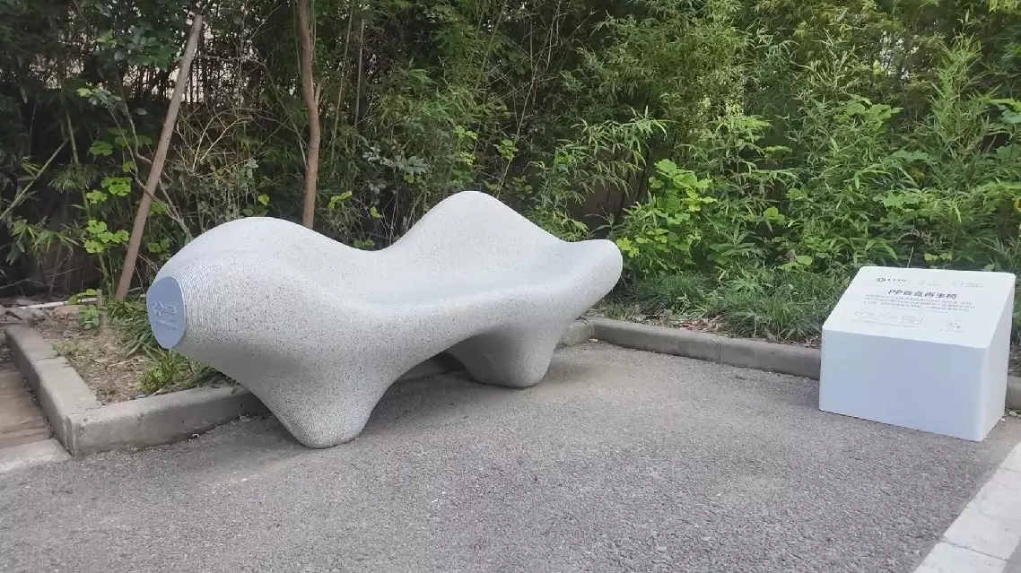 The environment-friendly bench is a reflection of the neighborhood's recycling efforts. Residents make it a habit of bringing recyclable waste to smart recycling bins set up in the neighborhood compound. Plastic waste then gets sorted out, cleaned and reprocessed into high-grade recycled pellets, making them once again useful materials.