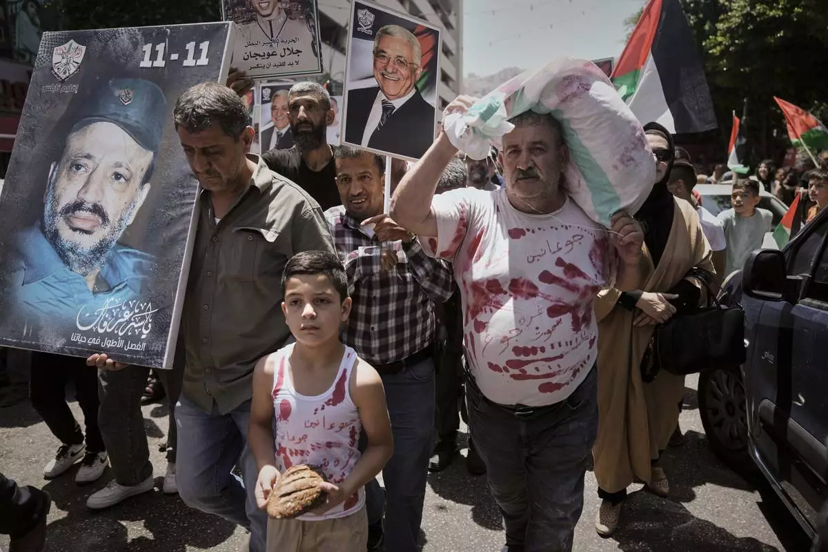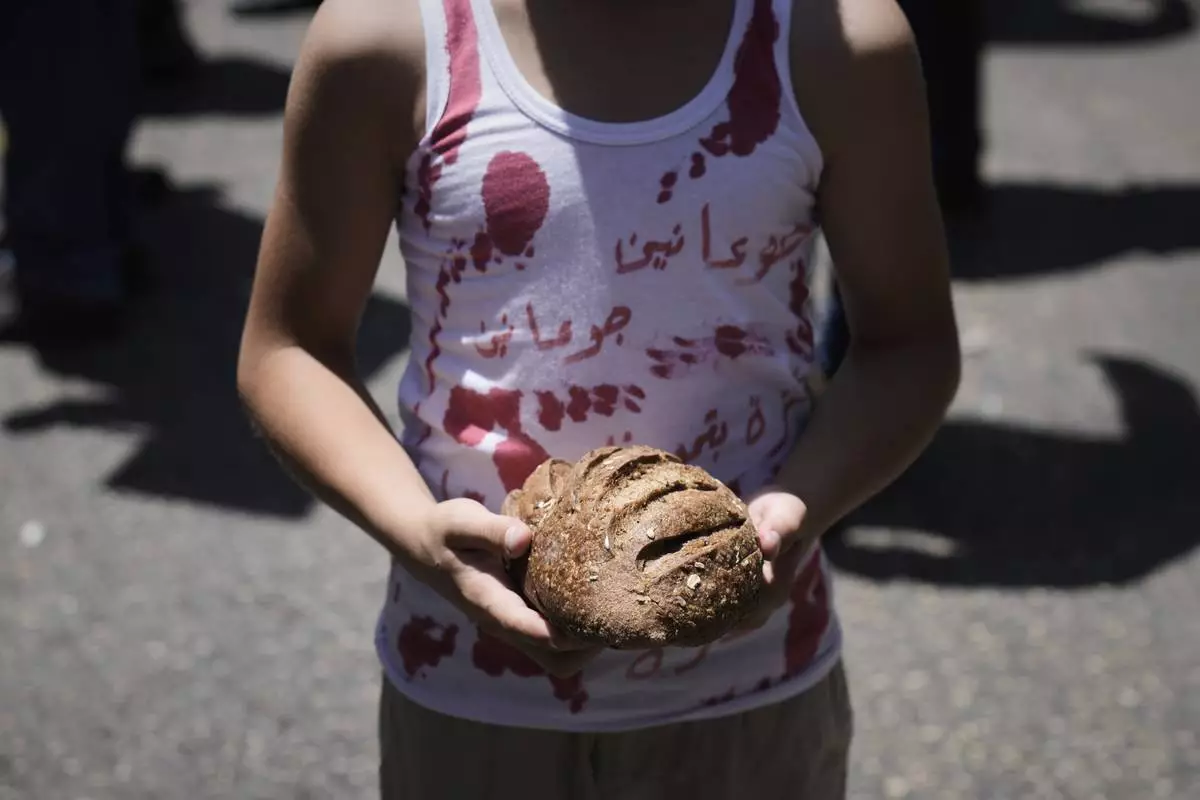 A child wearing a shirt stained with fake blood takes part in a demonstration in support of Palestinians in the Gaza Strip, amid the ongoing Israel-Hamas war, in Nablus, West Bank, Sunday, Aug. 3, 2025. (AP Photo/Majdi Mohammed)