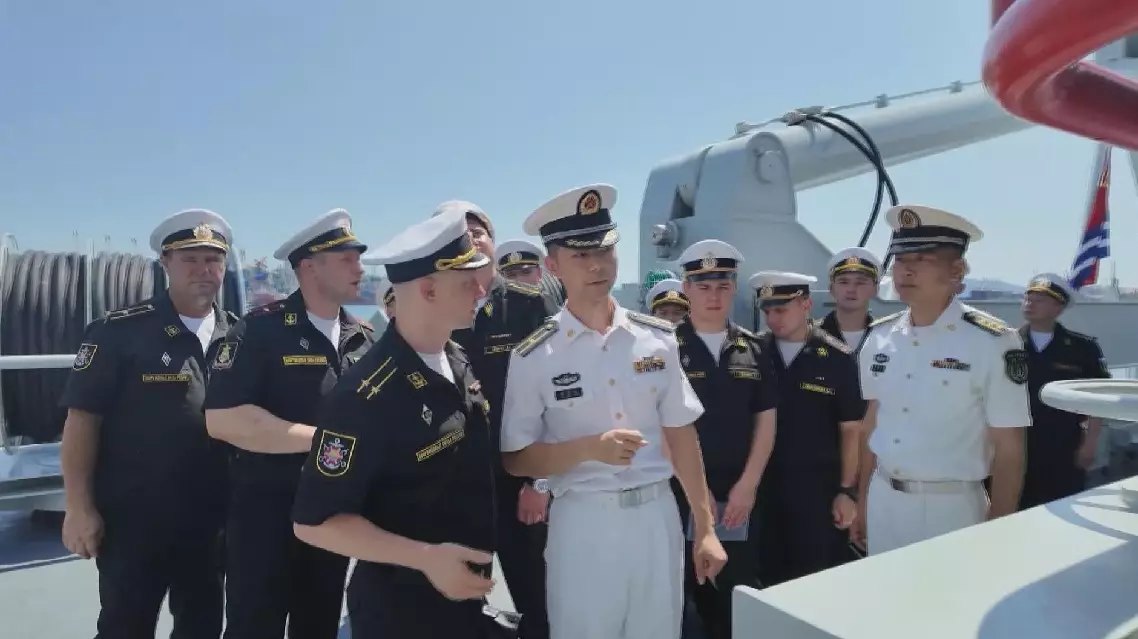 Earlier at a military port in Vladivostok of Russia's far east, the Chinese naval fleet hosted a reception on the deck of Type 052D destroyer Shaoxing on Friday.