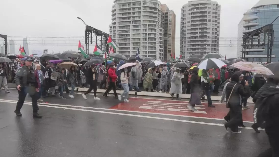 Thousands of protesters carrying the Palestinian flag walked north across the iconic bridge before being stopped by police due to safety concerns.
