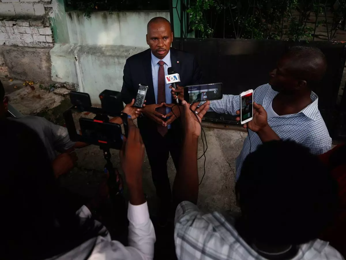 FILE - Senator Nenel Cassy speaks to journalists after a news conference in Port-au-Prince, Haiti, Oct. 3, 2019. (AP Photo/Rebecca Blackwell, file)