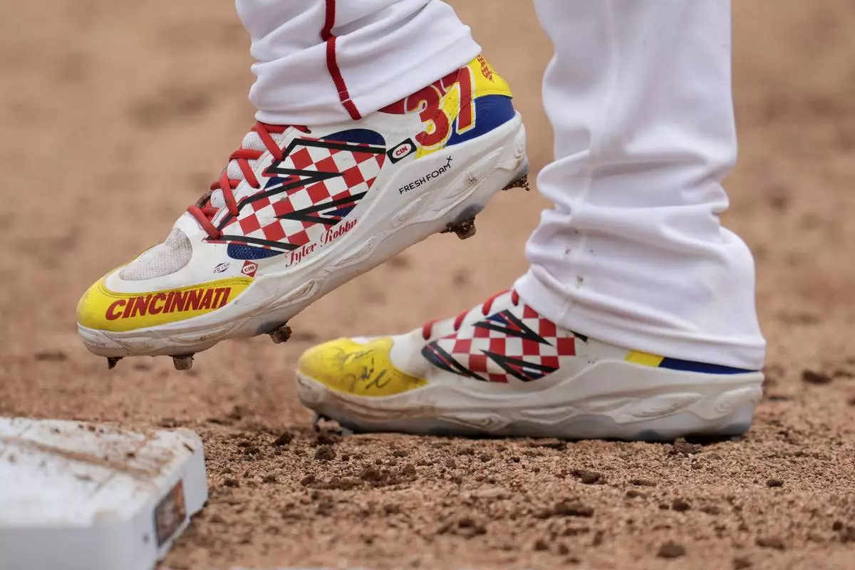 Cincinnati Reds' Tyler Stephenson stands on first during the eighth inning of the MLB Speedway Classic baseball game against the Atlanta Braves at Bristol Motor Speedway in Bristol, Tenn., Sunday, Aug. 3, 2025. Play was resumed today after yesterday's weather delay. (AP Photo/George Walker IV)