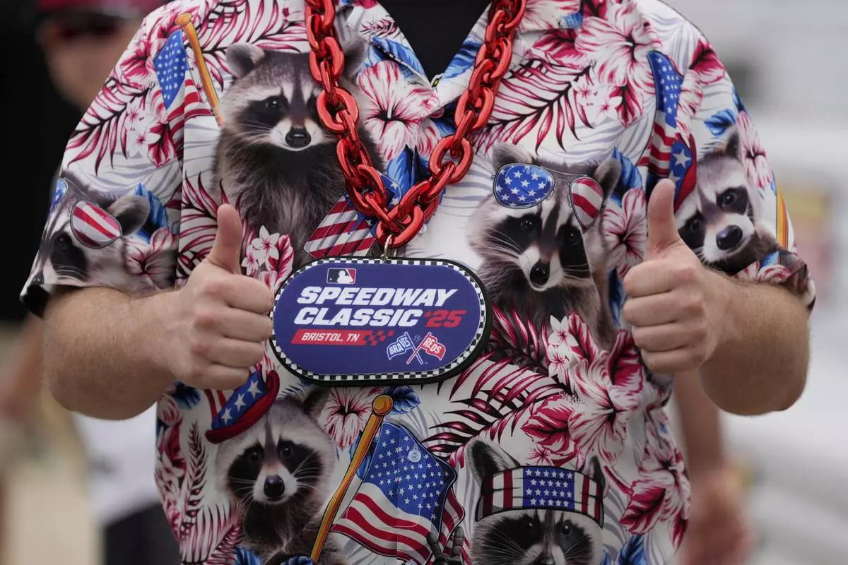 A fan poses before the MLB Speedway Classic baseball game at Bristol Motor Speedway in Bristol, Tenn., Sunday, Aug. 3, 2025. Play was resumed today after yesterday's weather delay. (AP Photo/George Walker IV)